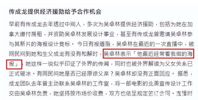 这里面,有多少是通过成龙的关系拿到的业务,我们就不得而知了。 不过吴卓林在直播间回应网友关于父女间是否和解的问题时,吴卓林没有直接回应是或者否,而是用11字回应: 他最近经常看我做的海报。