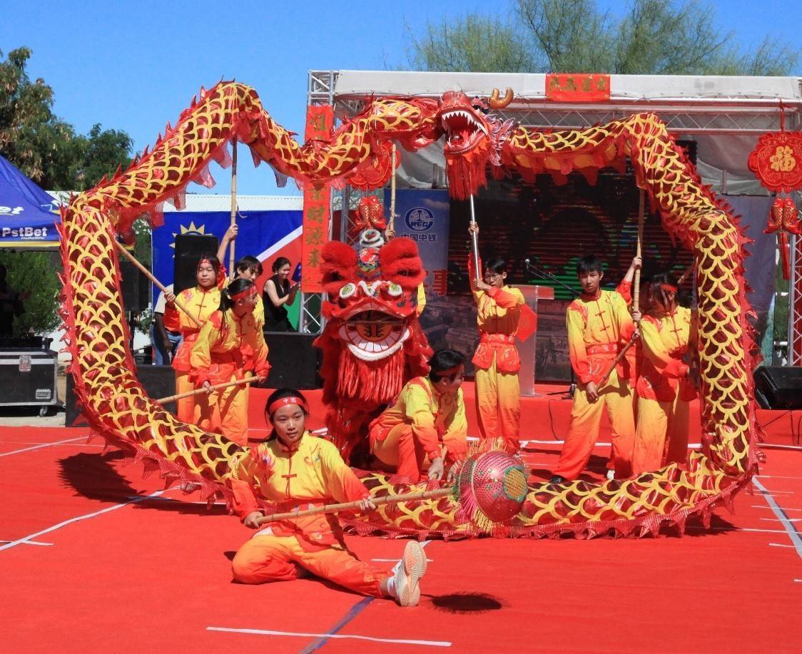 盛典现场的舞龙舞狮表演。中铁七局纳米比亚公司供图