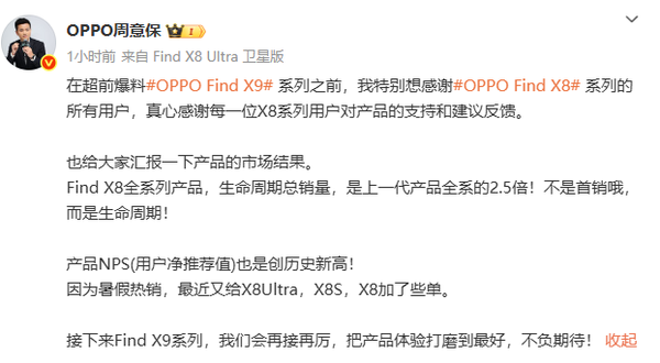 周意保特别感谢了FindX8系列用户的长期支持与产品反馈。他指出,这一销量数据并非指首销成绩,而是涵盖整个产品生命周期的累计销量,反映出该系列在市场上的持续受欢迎程度。得益于暑期销售旺季的强劲表现,OPPO近期已对FindX8Ultra、X8S及X8标准版追加了生产订单,以满足市场需求。