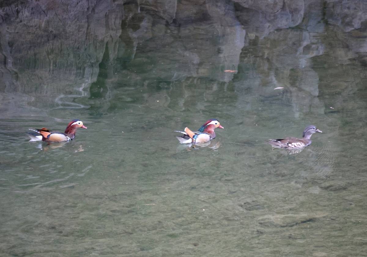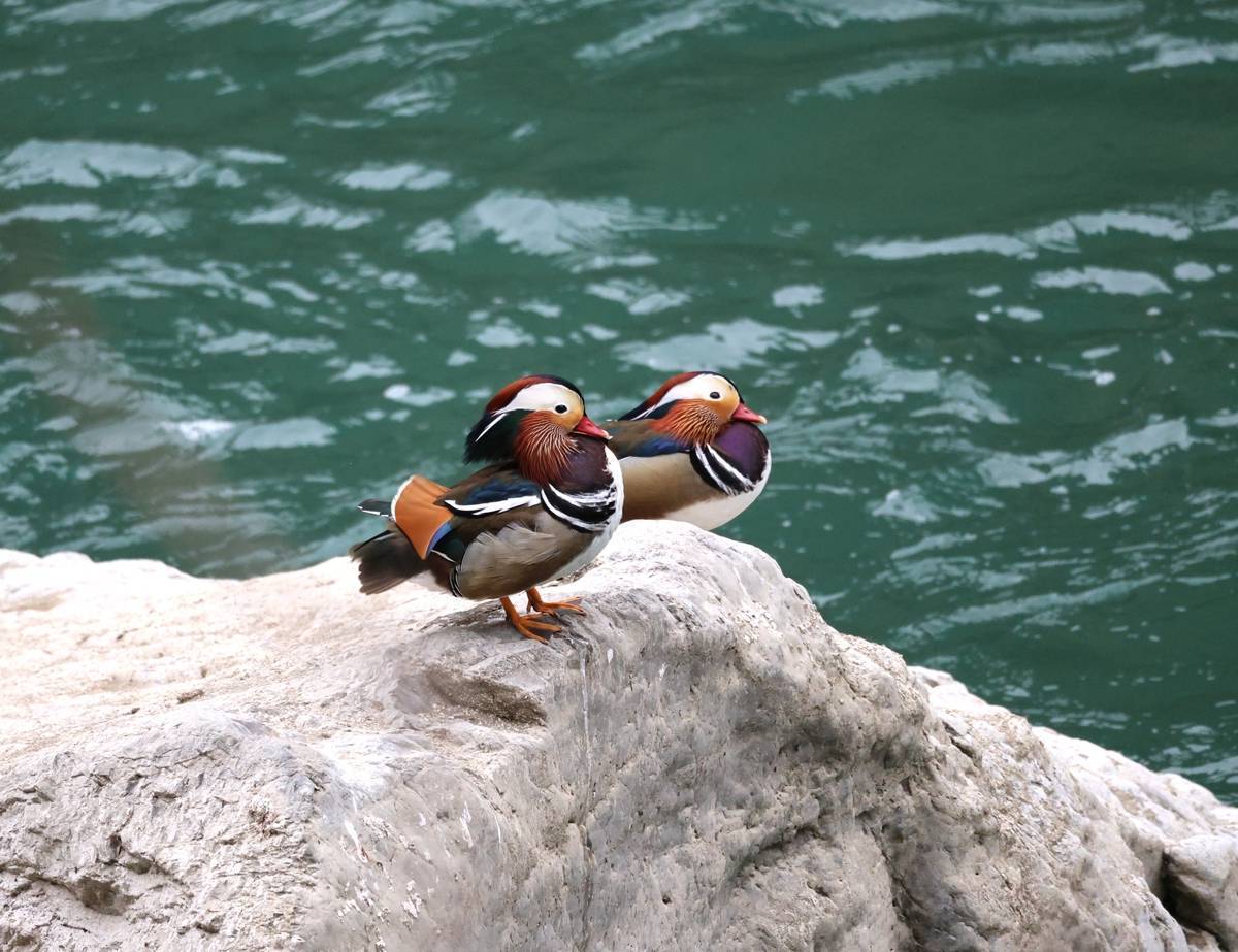 当天,袁孝文沿河岸开展巡护监测时,远远便望见河面泛起阵阵涟漪,数十只鸳鸯结伴游弋,打破了水面的静谧。雄鸳鸯羽色艳丽夺目,翠绿色的头顶、橙红色的喙搭配别致的帆状饰羽,在阳光下熠熠生辉;雌鸳鸯通体素雅温润,羽色柔和,雌雄相伴、动静相宜,尽显自然灵秀之美。